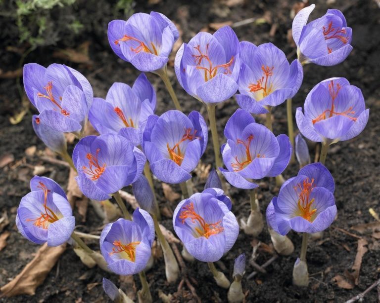 Нежный осенний крокус с огромными прозрачно-лиловыми чашевидными цветками в вуали из более темных жилок потрясающе смотрится в саду на фоне опавших листьев. Диаметр цветочной чаши - 5 см. Луковицы высаживают возле кустарников, на рабатках и в бордюрах, группами на газонах, на береговой линии садового у водоема. Синевато-фиолетовые цветки эффектно смотрятся на фоне растений с жёлтой и серебристоой листвой.