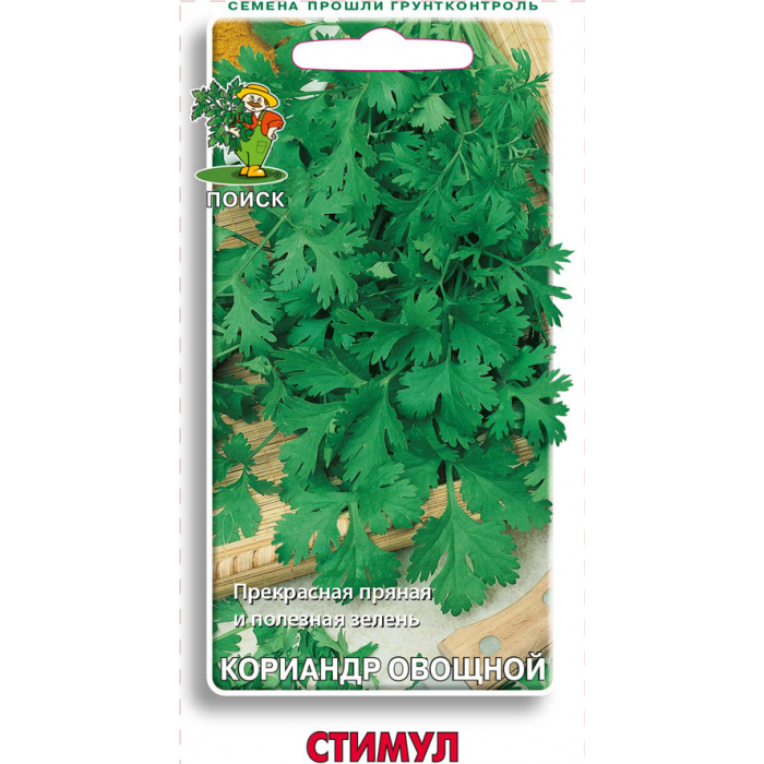 Кориандр Стимул - Период от всходов до уборки на зелень 35-40 дней, семена созревают через 105-120 дней. Розетка растения компактная, прямостоячая, густооблиственная, высотой 25-30 см. Листьев в розетке 12-27 шт. Лист темно-зеленый, глянцевый. Надрезанность края листа глубокая. Черешок зеленый, иногда с антоцианом, составляет 1/2 длины листа. Масса растения 20-40 г. Листья в свежем виде используют в кулинарии. Семена добавляют как пряную приправу для ароматизации хлеба и кондитерских изделий, в маринады, при приготовлении пряных смесей.