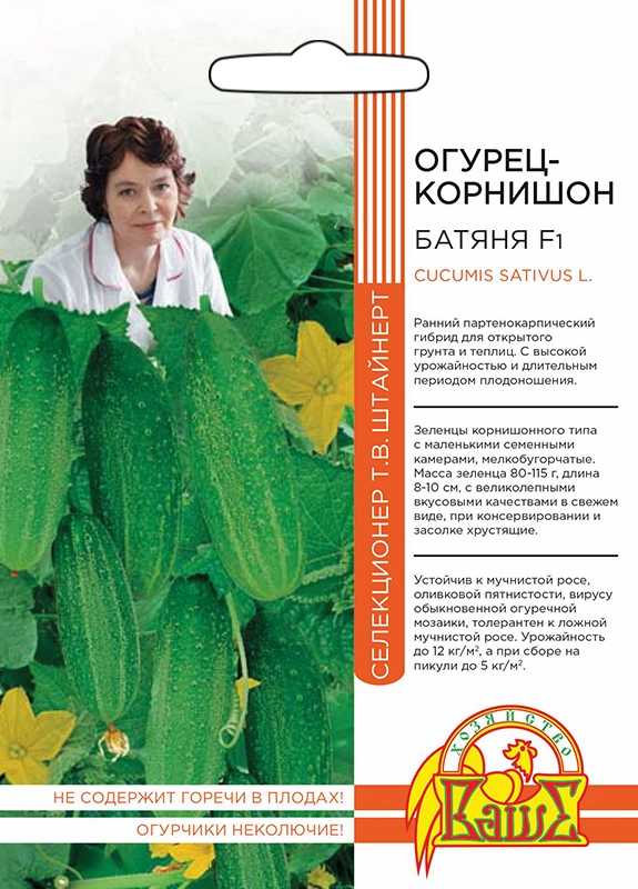 Вкус корнишонов отличный, без горечи. Товарность — превосходная, огурчики — один к одному, обладают высокой транспортабельностью. Хоть в салат, хоть в засол. Кстати, при термической обработке Батяня F1 не «сдаёт позиций», оставаясь хрустящим и без пустот. Гибрид можно выращивать с подвязкой к опоре или врасстил на грядах. Батяня F1 — огурцы без особых хлопот!