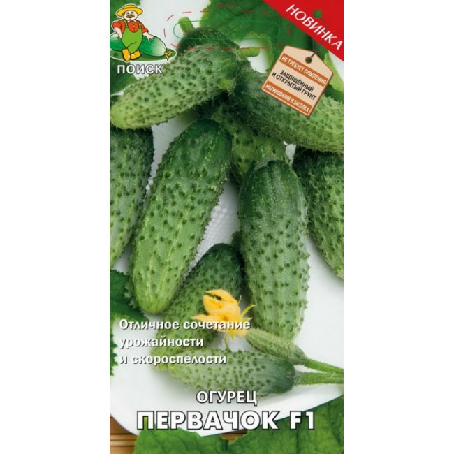 Огурец Первачок F1 - Партенокарпический гибрид для защищенного и открытого грунта. Период от всходов до плодоношения 38-40 дней. В узле 3-4 зеленца. Плоды цилиндрические, темно-зеленой окраски, белошипые, крупнобугорчатые, расположение бугорков средней плотности, длиной 11-13 см. Масса 90-100 г. Устойчив к кладоспориозу, вирусу огуречной мозаики, мучнистой росе и относительно устойчив к пероноспорозу. Рекомендуется для маринования и засолки.