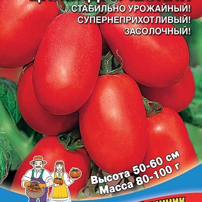 Раннеспелый супернеприхотливый сорт со стабильной урожайностью. Растение детерминантное, высотой 50-60 см. Не требует пасынкования. Плоды цилиндрические, красные, массой 80-100 г, сочные, плотные.