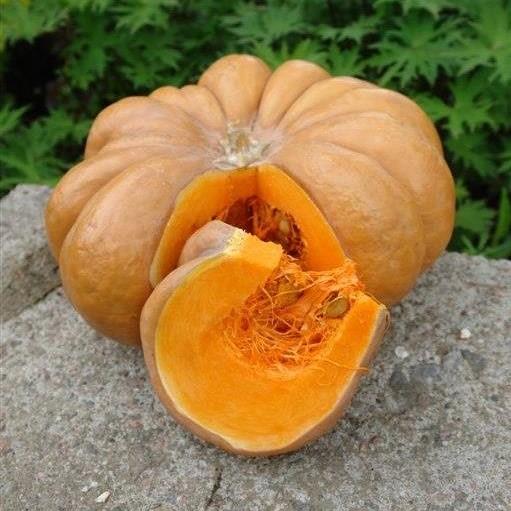 Красивые плоды-тюрбаны, 10% сахаров в толстой мякоти, вкусные детские соки и пюре. Среднеспелый крупноплодный сорт французской селекции с идеальным сочетанием вкусовых и товарных качеств. Сорт среднеплетистый, формирует плоскоокруглые дольчатые плоды, массой до 10кг. Мякоть без острого тыквенного запаха, оранжевая, толстая