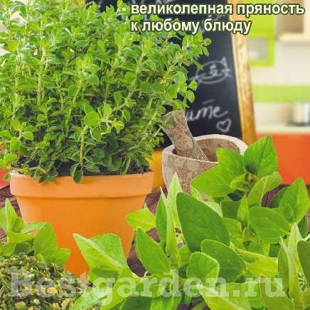 Орегано Греческий 0,05 гр. - Многолетнее пряно-ароматическое, лекарственное и декоративное растение. Куст прямостоячий, сильно облиственный, высотой 40-60 см, цветки мелкие, светло-пурпурные, собраны в щитковидные соцветия. Молодые побеги обладают сильным, приятным ароматом и горьковатым жгучим вкусом, содержат эфирные масла, минеральные соли, дубильные вещества, органические кислоты. В кулинарии в свежем и сушеном виде в качестве приправы к овощным и мясным блюдам, для консервирования и приготовления чайных напитков. Эфирные масла орегано обладают тонизирующим, улучшающим пищеварение и возбуждающим аппетит действием. Применяют как отхаркивающие средство при заболеваниях органов дыхания. Великолепно отрастает после срезки, что дает возможность получать урожай в течение всего летне-осеннего периода.