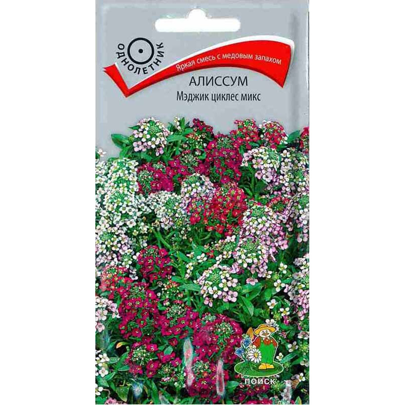 Алиссум Мэджик циклес микс 0,1гр - Яркая смесь с медовым запахом для ковровых цветников и обрамления цветочных бордюров. Растение невысокое, до 15 см. Образует плотный, стелющийся ковёр. Цветы мелкие многочисленные. Цветет с июня до осени. Для непрерывного цветения периодически удаляют увядшие цветы и плоды. Используют для обрамления клумб, балконных ящиков, на каменистых горках, рокариях.