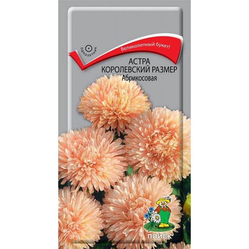 Астра королевский размер Абрикосовая - Растение широкораскидистое, высотой до 100 см. Соцветия оранжево-абрикосовой окраски. Цветет в августе - сентябре. Используют очень широко: для посадки в сборные цветники группами, на рабатки - рядами, для бордюров и срезки.