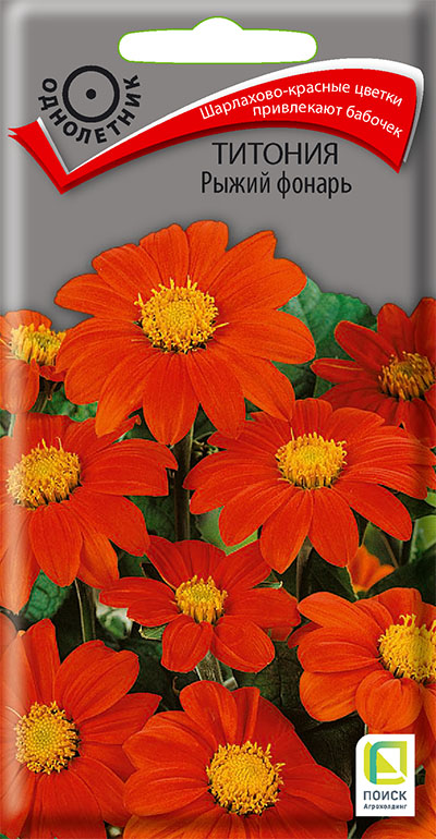 Роскошные высокие кусты высотой 100 см. Родина титонии – Мексика, ее называют еще мексиканским подсолнухом. Стебли красноватые, слабо опушенные. Растение при всей своей мощности не требует подвязки. Соцветия крупные корзинки диаметром 5-8 см, красной окраски, с желтой серединой, напоминают немахровые георгины. Цветет с конца июля до заморозков. Используют в групповых посадках в миксбордерах.