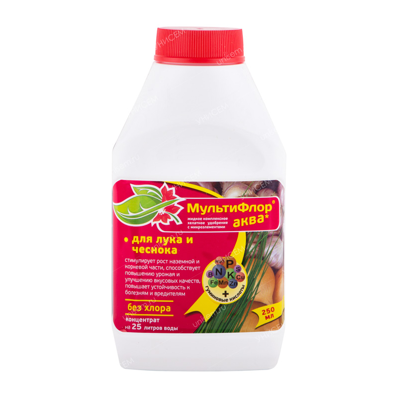 МультиФлор для лука и чеснока – жидкое комплексное хелатное удобрение с микроэлементами и гуминовыми кислотами. Применяется для корневой и внекорневой подкормки лука и чеснока. Препарат характеризуются пониженной нормой расхода и практически 100 % усвоением питательных веществ растениями.