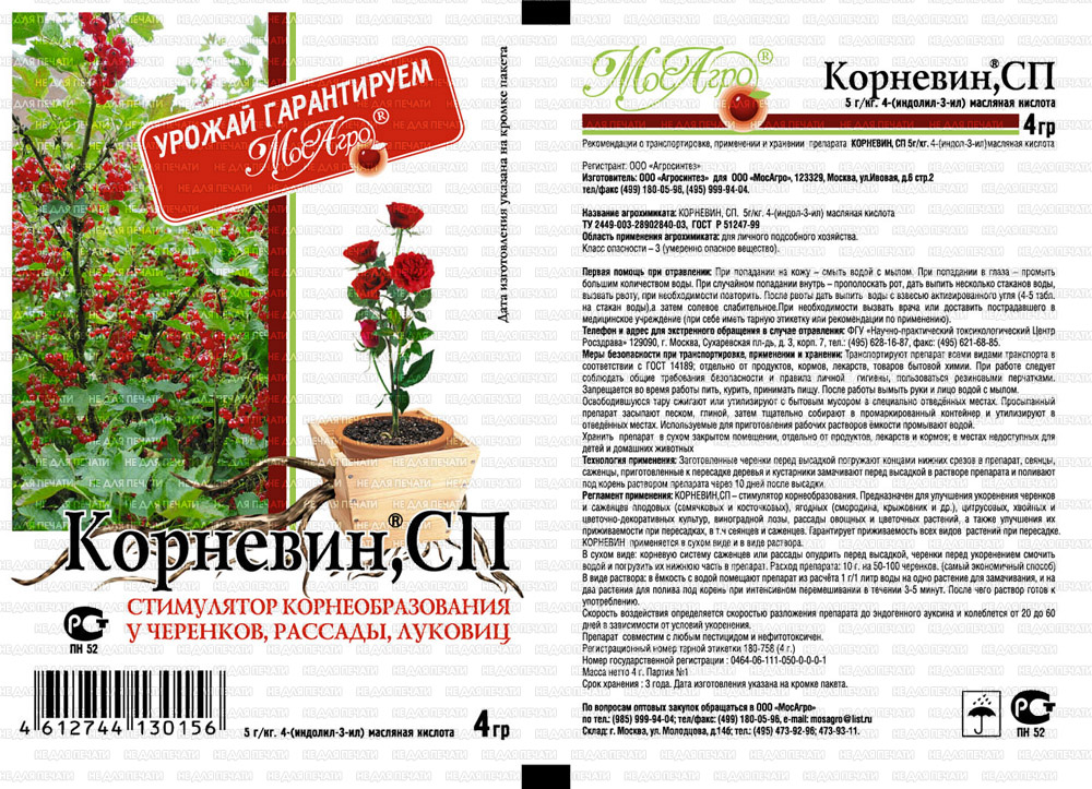 Стимулятор корнеобразования. Регулятор роста растений. Предназначен для улучшения ускорения черенков семечковых, косточковых (слива, вишня, черешня, персик) , ягодных (смородина, крыжовник и др.), виноградной лозы, цитрусовых и декоративных (роза, сирень, калина, чубушник и др.) культур, а также для улучшения их приживаемости при пересадках, в том числе сеянцев и саженцев.