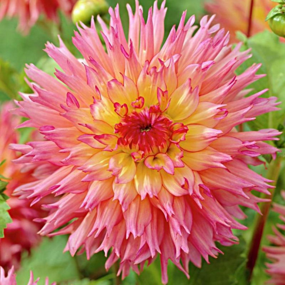 Георгина кактусовая Ненеккази - Высота растения 120 см, кустовидный, с крепкими цветоносами и красивой перистой листвой. Диаметр бутонов георгин этого сорта около 15 см. Пышные махровые соцветия собраны из множества изящных лепестков. У основания они насыщенно-желтые и скрученные, по краям – нарядно-розовые и эффектно рассечены, придавая бутону дополнительную выразительность и пышность.