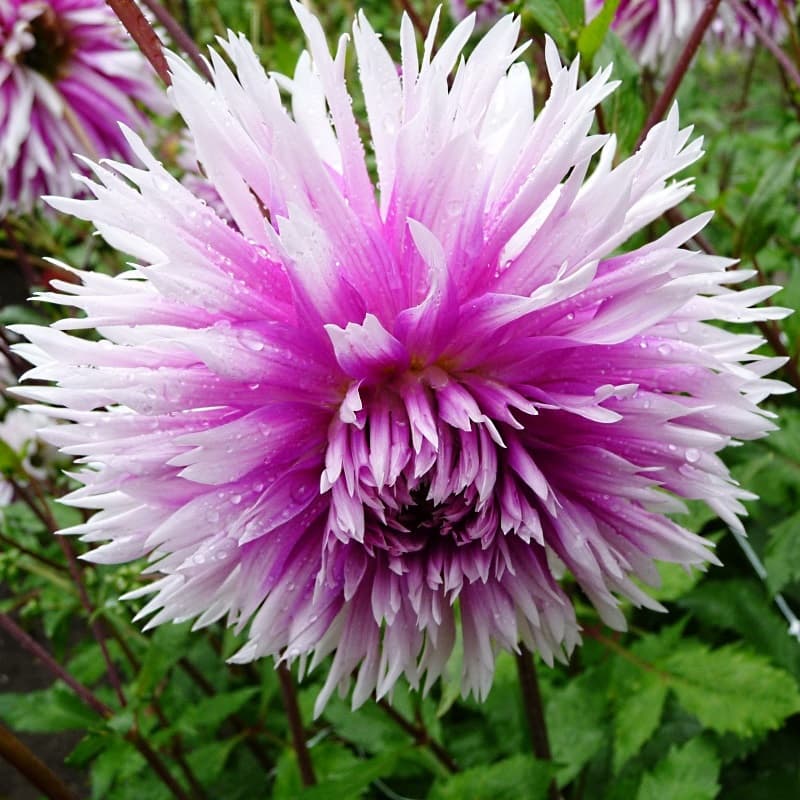 Георгина Тейбл Дансер бахромчатая - высота растения 90 см. Цветок невероятно яркий, пурпурно-фиолетовый с белыми кончиками. Растения обильно ветвятся, формируя пышные кусты с обилием цветоносов.