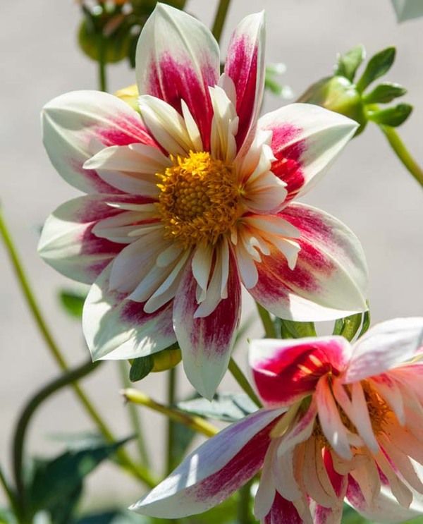 Яркая и озорная! На кремово-белых лепестках мазки малиново-красного и нарядный желтый венчик в центре.