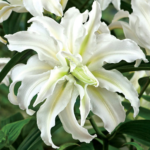 Лилия восточная махровая Полар Стар Lilium oriental double hybrids Polar Star - экзотически красивый цветок. Обладает привлекательным, необычно сладким ароматом цветка. Пышные цветы - благородного белого цвета с нежно-желтым оттенком у основания. Лепестки гофрированные на концах, слегка закрученные, трехслойные. Период цветения длится до 4 недель.
