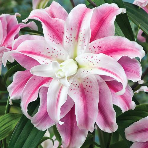 Лилия восточная махровая Свит Рози Lilium oriental double hybrids Sweet Rosy - очень эффектный гибрид, который поражает размером и многослойностью цветка. Махровый, нежно-розовый цветок с темно-малиновой продольной полосой, обладает большим количеством лепестков. Край лепестков обрамлен каймой сливочного цвета. Мелкий, редкий крап украшает бутон. Имеет насыщенный цветочный аромат.