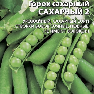 Горох Сахарный 2 - Среднеранний сахарный сорт. Стебель высотой 60 см. На одном растении образуется до 14 стручков темно-зеленого цвета, длиной 5-8 см, состоящих из 6-9 зерен. Сорт ценится за отсутствие в стручках пергаментной оболочки. В пищу используются целиком сочные, мясистые, очень сахаристые бобы с недозрелыми семенами.