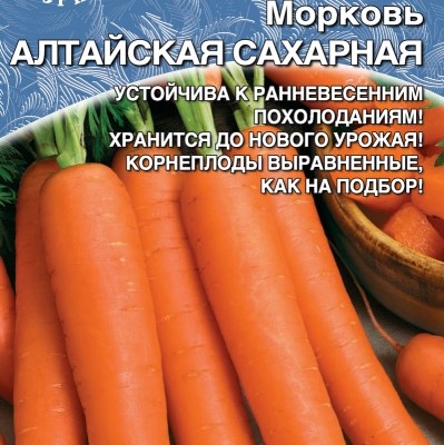 Морковь Алтайская Сахарная (на ленте) - Позднеспелый, невероятно холодостойкий сорт для хранения. Корнеплоды цилиндрические, тупоконечные, оранжево-красные, длиной до 25 см. Мякоть хрустящая, сладкая, сочная, с маленькой сердцевиной. Содержание сахаров и каротина повышенное, поэтому считается одним из лучших для использования в детском питании и изготовлении соков.