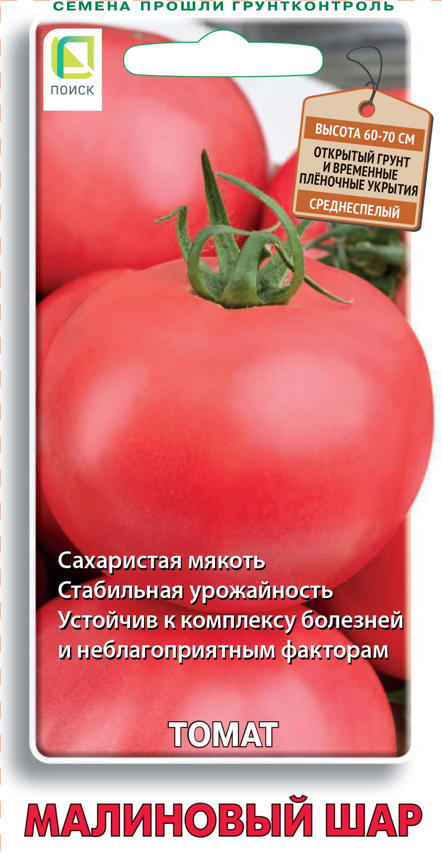 Томат Малиновый шар - сахаристая мякоть. Стабильная урожайность. Устойчив к комплексу болезней и неблагоприятным факторам. Деликатесный сорт с привлекательной малиново-розовой окраской. Среднеспелый детерминантный сорт для выращивания в открытом грунте и под временными плёночными укрытиями. От полных всходов до начала созревания плодов 110-115 дней. Растение среднерослое 60-70 см, требует подвязки и формирования. Плод малинового цвета, с гладкой поверхностью и глянцевым блеском, с сахаристой и сочной мякотью, массой 150-200 г. Число гнезд 4-6. Вкусовые качества свежих плодов отличные. Рекомендуется для приготовления салатов и нецельноплодного консервирования.