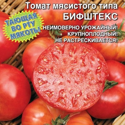 Томат мясистого типа Бифштекс - Среднеранний, высокоурожайный сорт для выращивания в теплицах и парниках. Растения индетерминантные, высотой 1,6-1,8 м. Плоды красные, плоскоокруглые, массой 250-300 г (отдельные до 500 г), мясистые, превосходного вкуса, не растрескиваются. Мякоть очень нежная, тающая во рту, сахаристая, с великолепным ароматом.