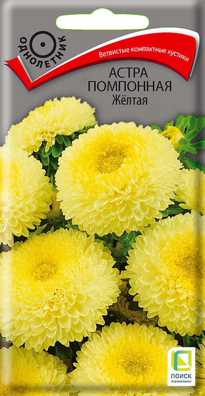 Чудо астры! Растение высотой 40-55 см, компактное, ветвистое. Цветоносы прочные. Соцветия плоскоокруглые, диаметром 4-5 см, жёлтой окраски. Язычковые цветки широкие короткие, расположены в 2-4 ряда по краю. Центр заполнен длинными трубчатыми цветками, собранными очень плотно и окрашенными также как язычковые. На растении до 30 соцветий. Цветет в июле-августе. Используют очень широко: для посадки в сборные цветники группами, на рабатки – рядами и на срезку.