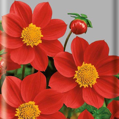 Георгина Мигнон красная - Растения компактные высотой около 45 см. Соцветия красные диаметром 8-9 см. Цветет с июля по октябрь. Используют в цветниках большими группами на клумбах. Прекрасный материал для срезки.