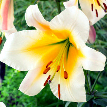 Лилия ОТ-гибрид Мисс Пекьюлиар Lilium OT-hybrids Miss Peculiar многолетнее травянистое, луковичное растение. Отличается очень крупными, широкочашевидными цветками и сильным ароматом, характерным для всех ОТ-гибридов. Получена в результате скрещивания Восточных и Трубчатых лилий. В закрытом состоянии бутон розового цвета. Когда он открывается, то мы видим нежные бело-розовые лепестки с ярко желтой серединой. Тычинки длинные с оранжевой пыльцой.