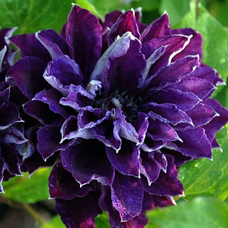 Клематис Шин-Шигоку Clematis Shin-Shigyoku - сорт японской селекции - крупноцветковый гибрид, цветущий на побегах прошлого и текущего года темно-фиолетовыми, махровыми цветками с изогнутыми лепестками, тычинки с фиолетовыми пыльниками на белесых нитях. Отцветшие цветки необходимо обрезать, чтобы получить повторное цветение в начале осени. Может плестись по натуральным опорам, например, лиственным и хвойным кустарникам. Подходит для выращивания в контейнерах. Устойчив к болезням, неплохо зимует.