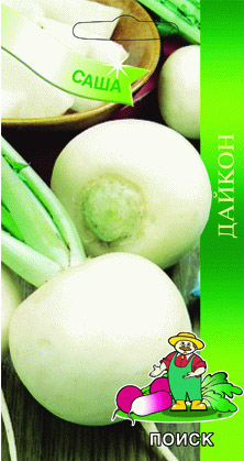 Дайкон Саша – раннеспелый сорт. Период от всходов до уборки урожая 35-40 дней. Корнеплоды округлые или округло-овальные, белые, гладкие. Корнеплоды наполовину погружены в почву. Их длина 6-10 см, диаметр 5-9 см, масса 200-400 г. Мякоть нежная, плотная, хрустящая, очень сочная. Вкусовые качества отличные. Сорт жаростойкий, устойчив к цветушности и бактериозу. Хорошо растет на тяжелых почвах. Используют в свежем виде.