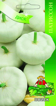 Патиссон Диск – раннеспелый сорт. Растение кустовое, образует 1-2 боковых побега. Плод дисковидный со слабовыраженной зубчатостью по краю. Поверхность гладкая, слабосегментированная, белая. Кора тонкая. Мякоть белая, хрустящая. Масса плода 350-450 г. Используют молодые завязи, когда мякоть нежная и семена не развиты.
