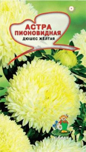 Астра пионовидная Дюшес жёлтая изумительные букеты для срезки. Куст колонновидной формы, ветвистый, высотой 70 см. Цветоносы прочные, густооблиственные. Соцветия желтые, полусферические, густомахровые, непоникающие, 8- 10 см в диаметре. Язычковые цветки широкие, приподняты вверх, закрывают трубчатые цветки. Цветет август-сентябрь. Используют для посадки в сборные цветники группами, на рабатки – рядами и для срезки.