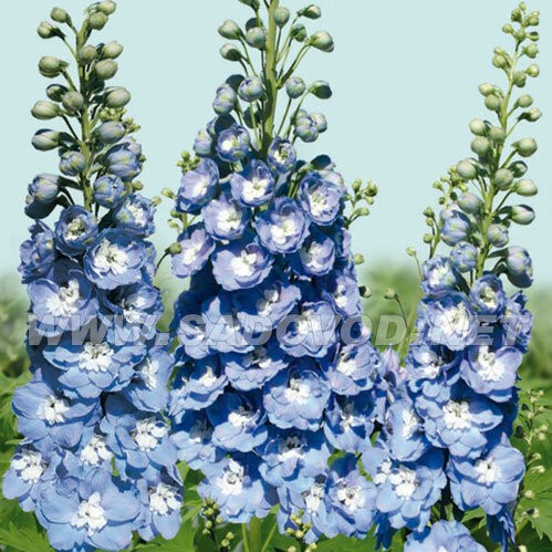 Дельфиниум Мэджик Фонтейнс Скай Блю Вайт Би - Популярный многолетник с богатым цветением! Высота растения 90-120 см. Цветки полумахровые диаметром 5-6 см. Цветоносы прочные, собраны в длинные, конусовидные соцветия (до 50 см). Окраска - голубая с белым центром. Используют как на срезку, так и в комбинациях с другими растениями.