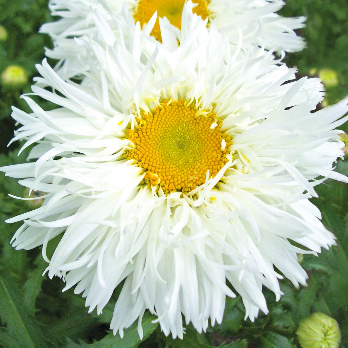 Нивяник махровый - Очаровательные "пушистые" соцветия. Высота 60-70 см. Махровые соцветия с белыми лепестками и жёлтой серединой, в диаметре 6 см. Обильное цветение в июне-июле. Используются для групповых посадок в цветники, рядами на рабатки, а также для срезки в букеты. В воде стоят 8-10 дней.